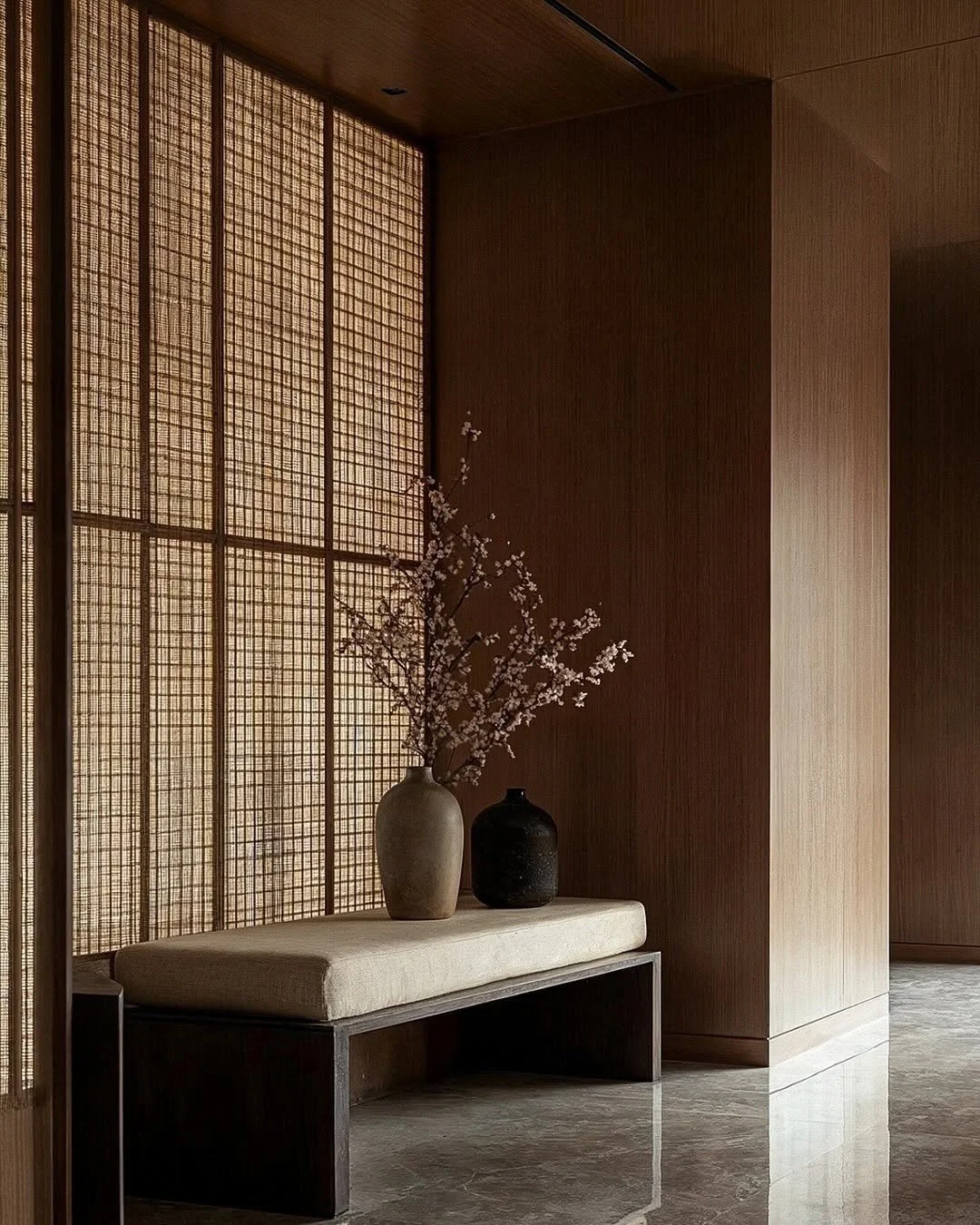 großzügiger Eingangsbereich mit nachhaltigen Materialien wie Stein und Holz und Raumteiler aus Bambus